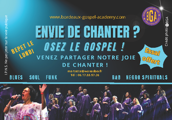 Vous pouvez également écrire un mail à martotte@wanadoo.fr, ou nous suivre sur notre page Facebook : Bordeaux Gospel Academy, ou sur notre Instagram : gospelbordeaux.
